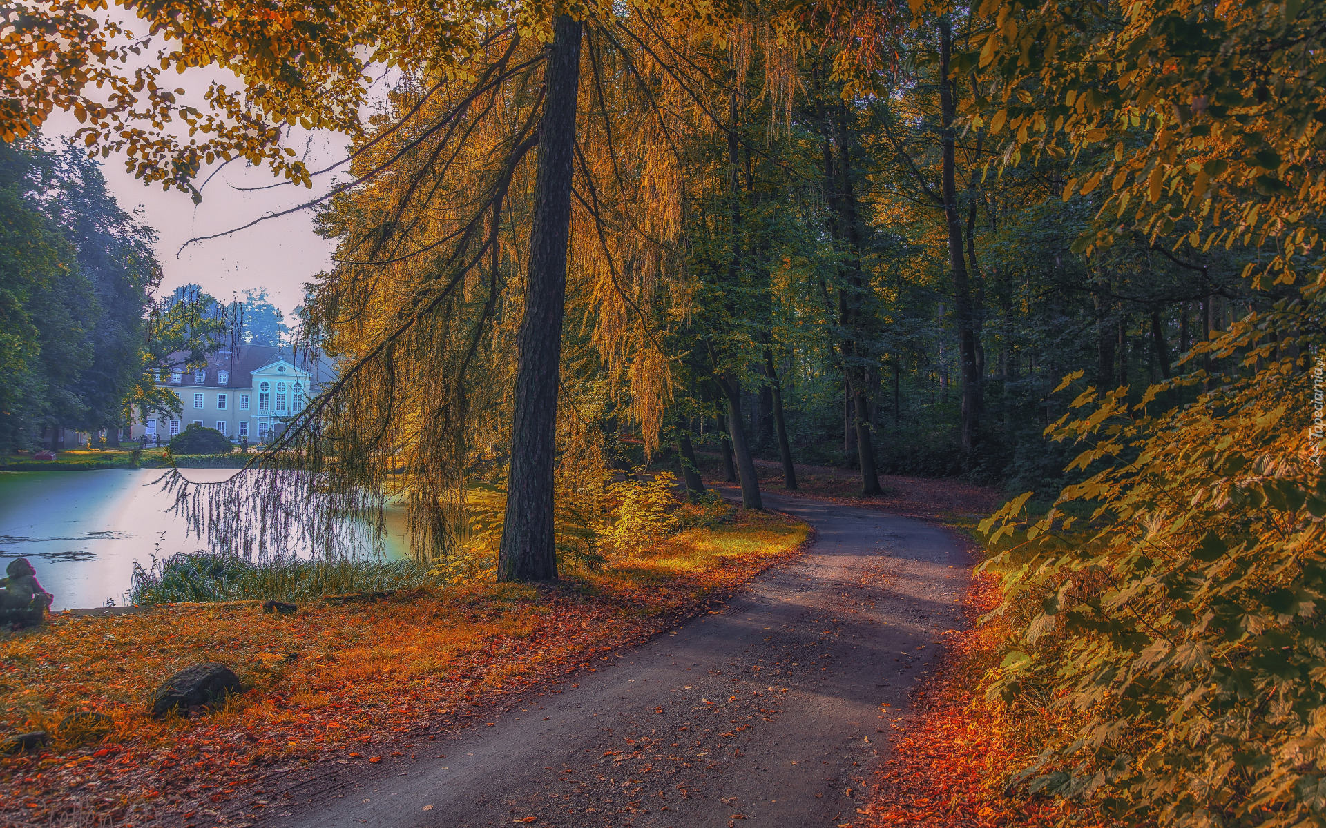 Edytor tapety: Jesienne drzewa i droga nad stawem w parku