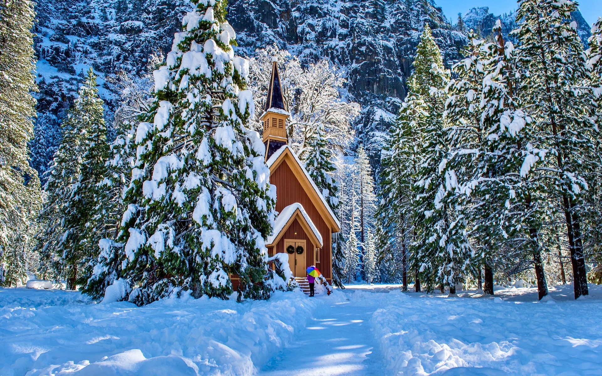 Edytor tapety: Kościół pod ośnieżonymi świerkami w Parku Narodowym Yosemite