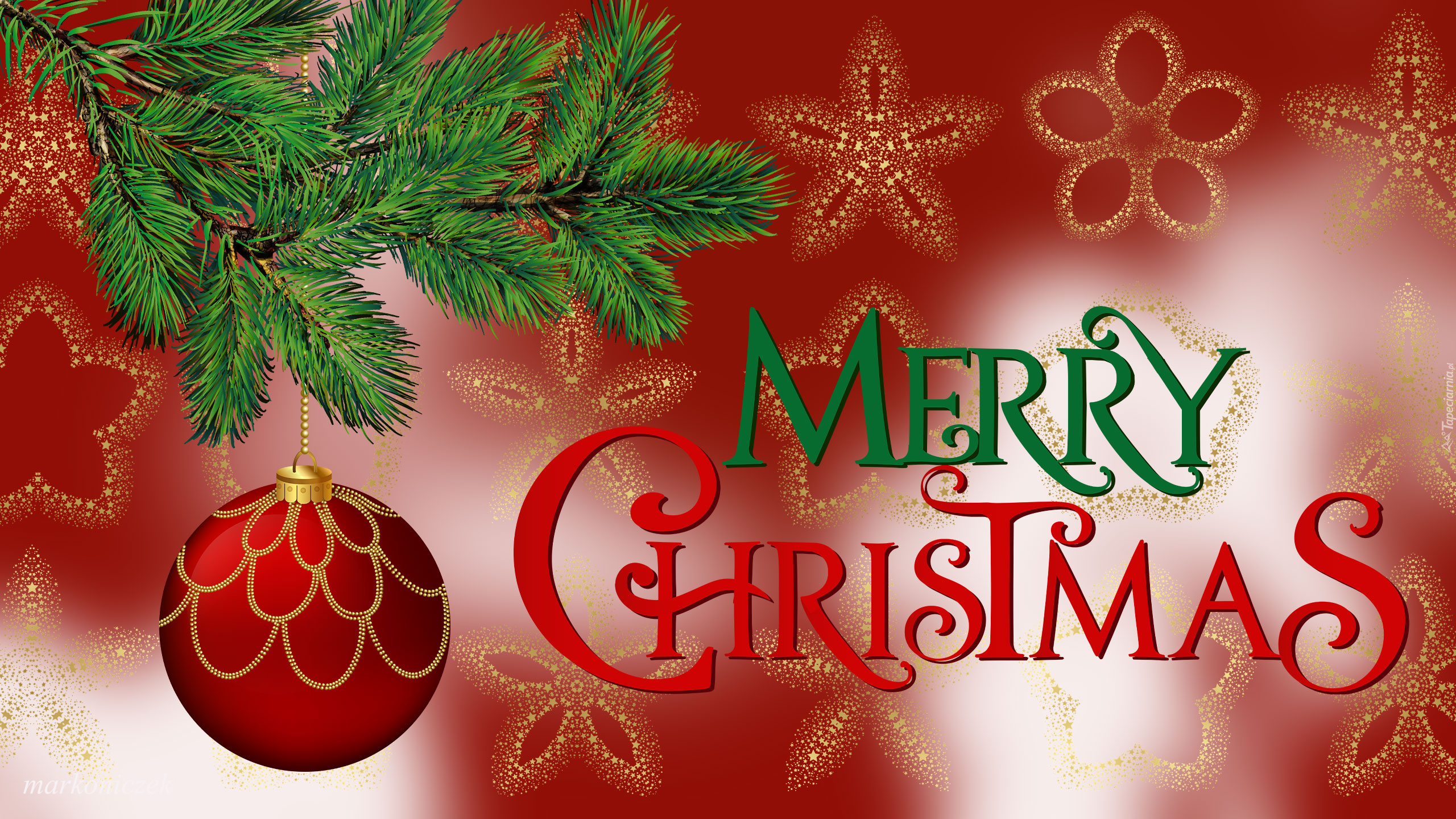 Edytor tapety: Napis Merry Christmas obok czerwonej bombki na gałązce