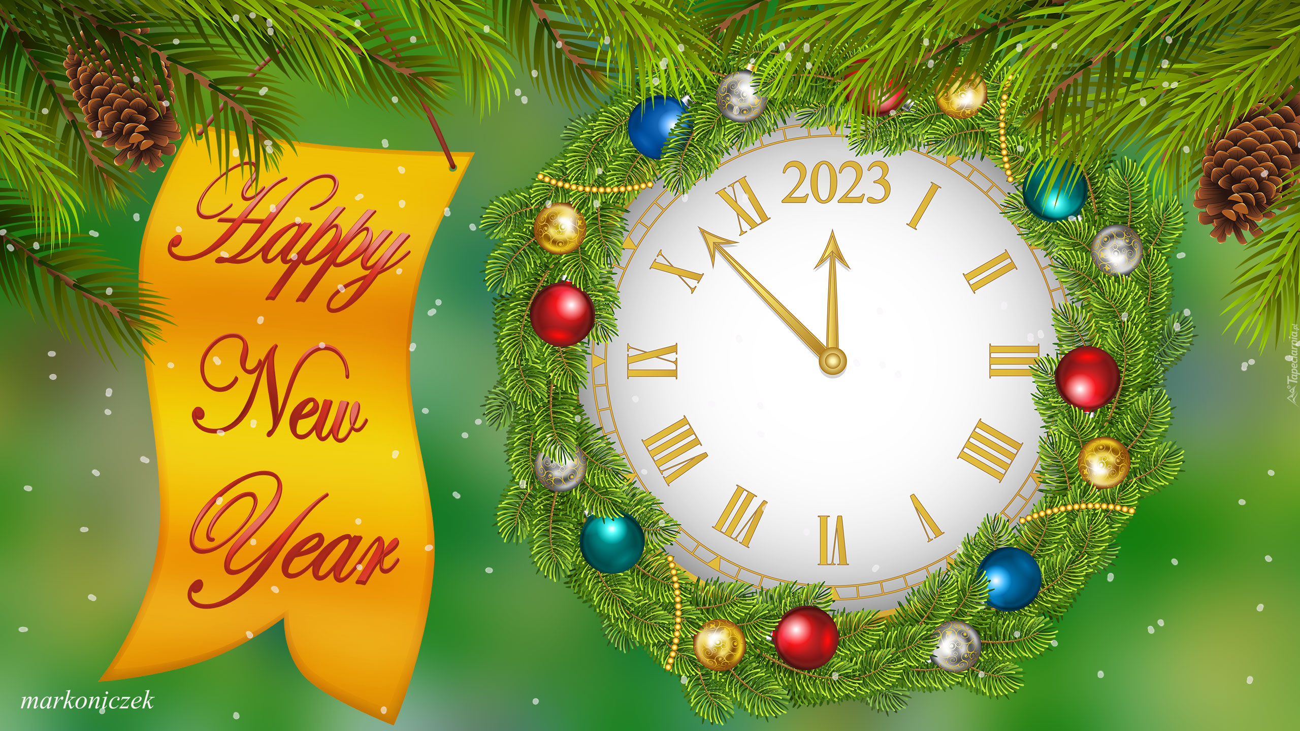 Edytor tapety: Kartka z życzeniami noworocznymi na gałązce obok zegara