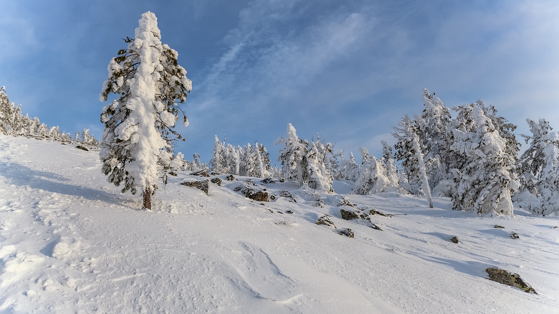 Edytor tapety: Ośnieżone drzewa i kamienie na wzgórzu