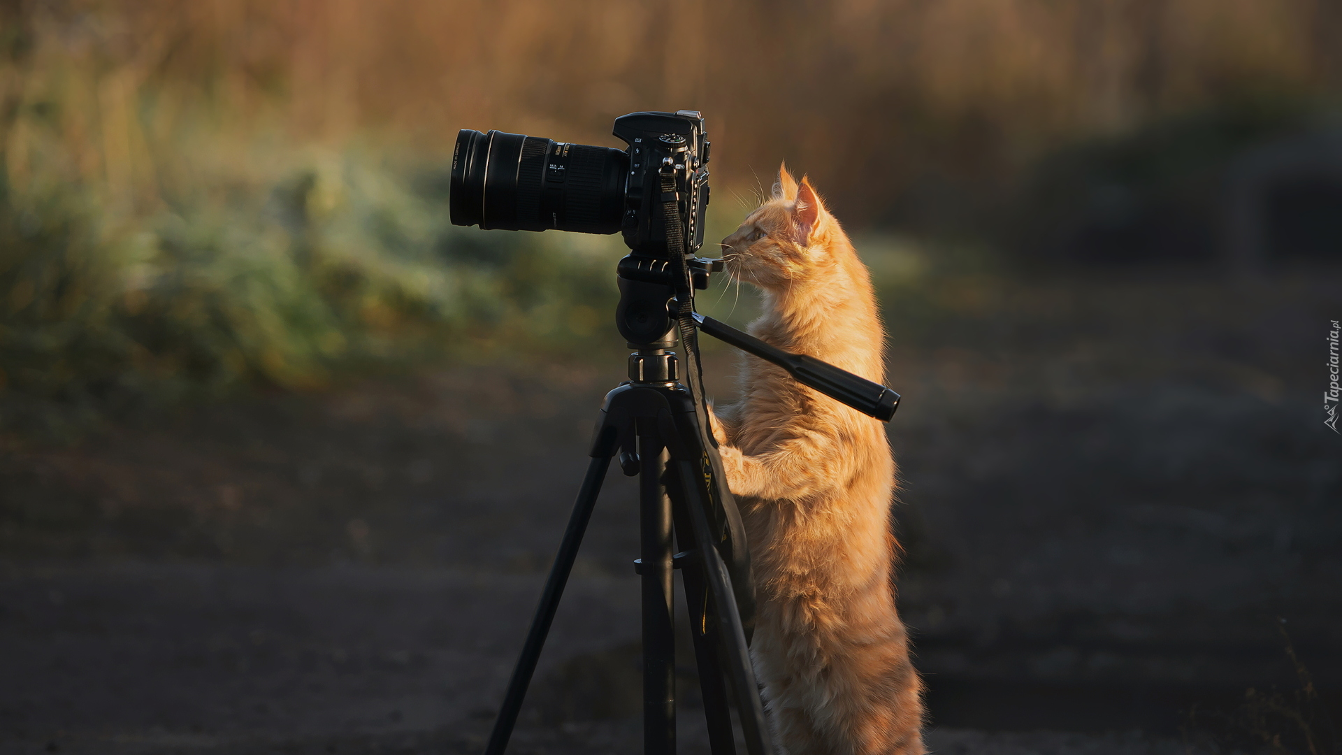 Edytor tapety: Rudy kot oparty o statyw z aparatem fotograficznym