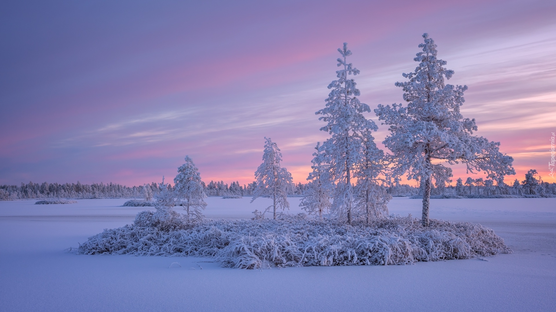 Edytor tapety: Oszronione drzewa i trawy pod kolorowym niebem