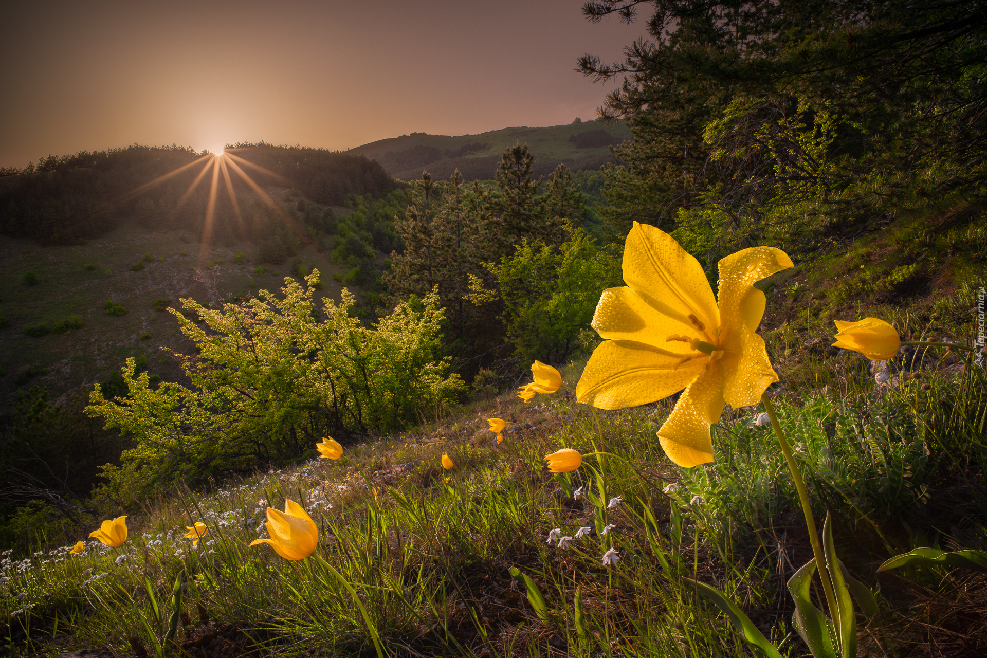 Edytor tapety: Rozkwitnięte żółte tulipany na łące