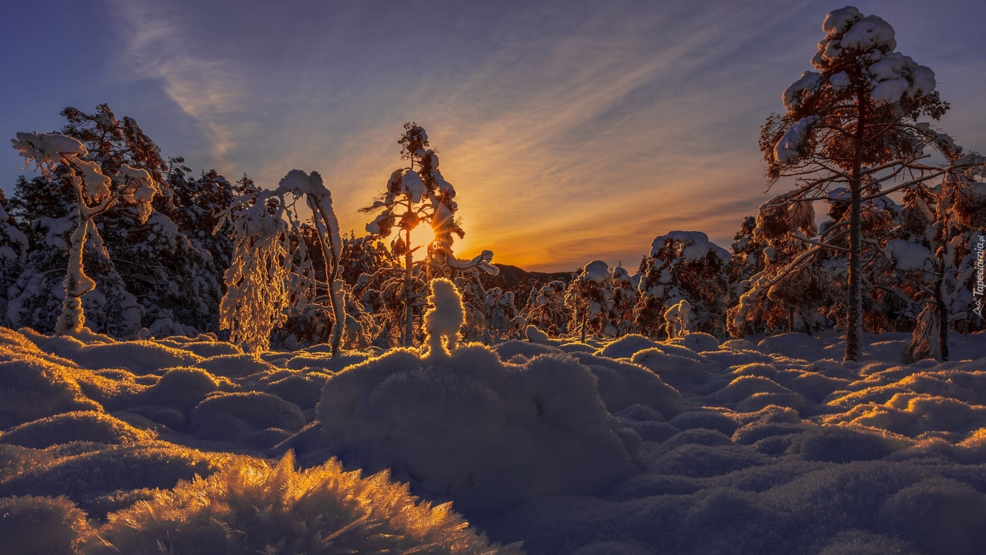Edytor tapety: Zasypane śniegiem drzewa w blasku zachodzącego słońca