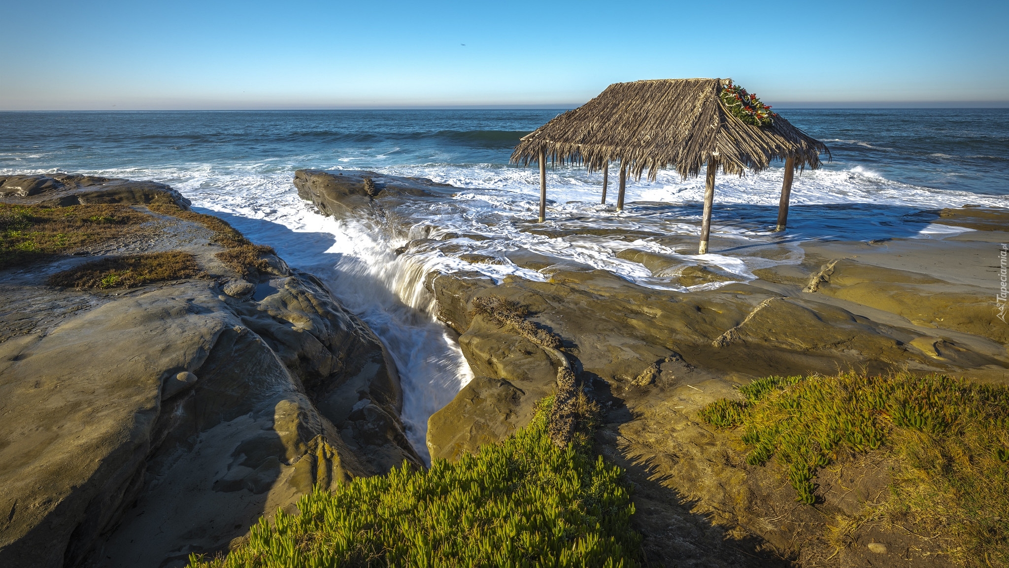 Edytor tapety: Trzcinowa altana na skałach przy morzu
