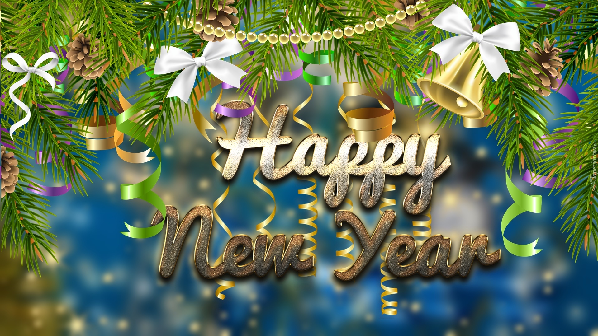 Edytor tapety: Napis Happy New Year pod udekorowanymi gałązkami