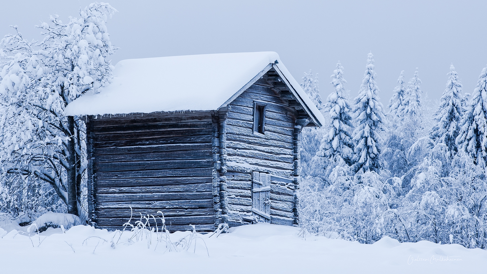 Edytor tapety: Szopa w śniegu na skraju ośnieżonego lasu