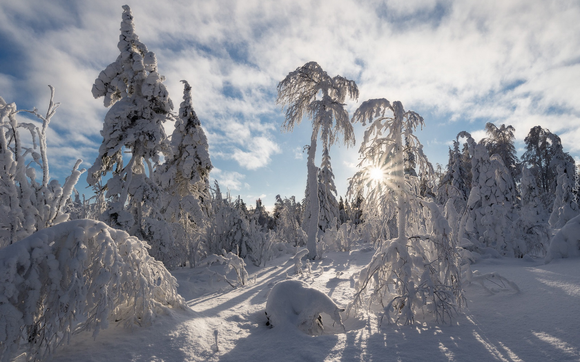 Edytor tapety: Zasypane śniegiem drzewa w promieniach słońca