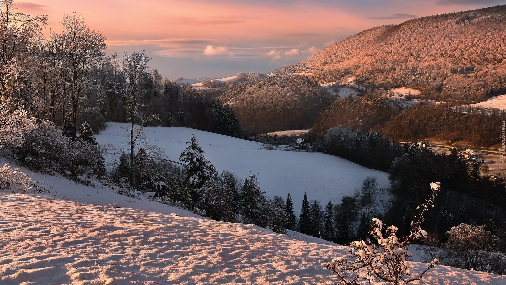 Edytor tapety: Śnieg na zalesionych zboczach góry w Tiefmatt