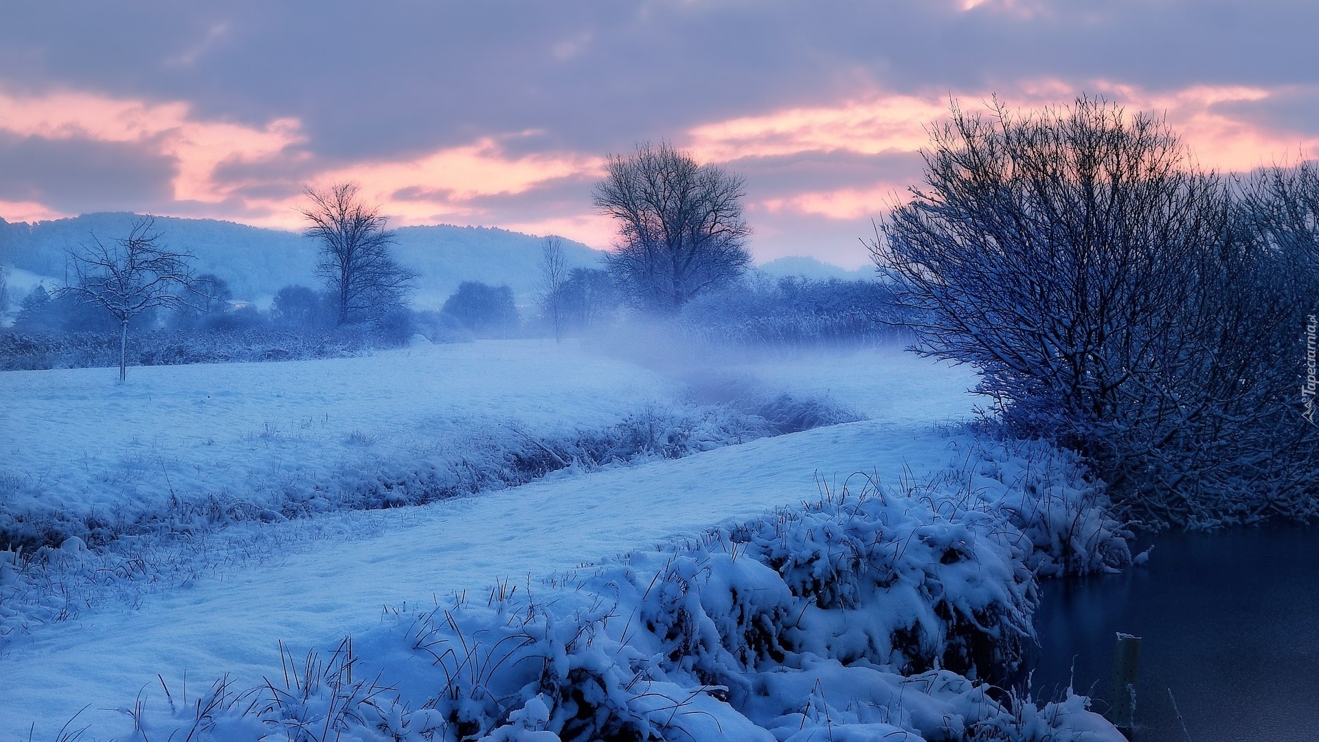 Edytor tapety: Zamglony poranek nad zaśnieżoną łąką