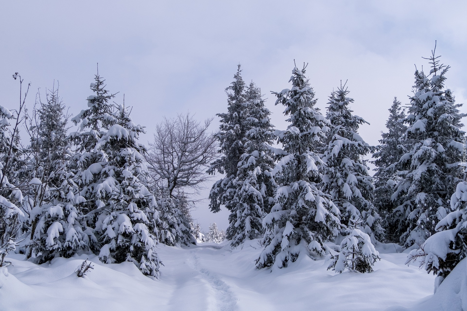 Edytor tapety: Ślady w śniegu obok zaśnieżonych drzew