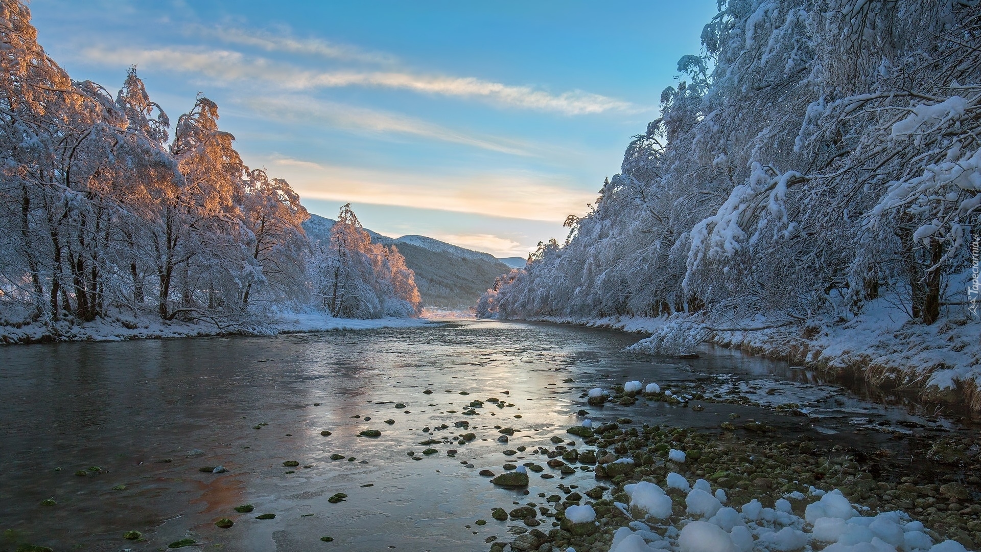 Edytor tapety: Oprószone śniegiem drzewa nad rzeką
