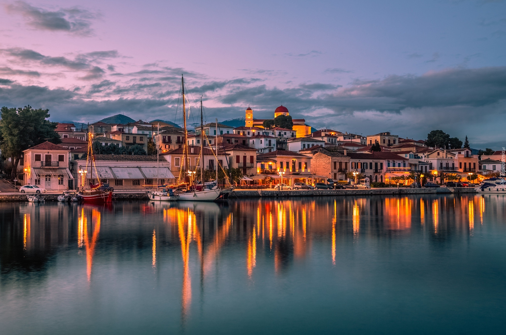 Edytor tapety: Oświetlone miasto Galaxidi przy nabrzeżu w Zatoce Korynckiej