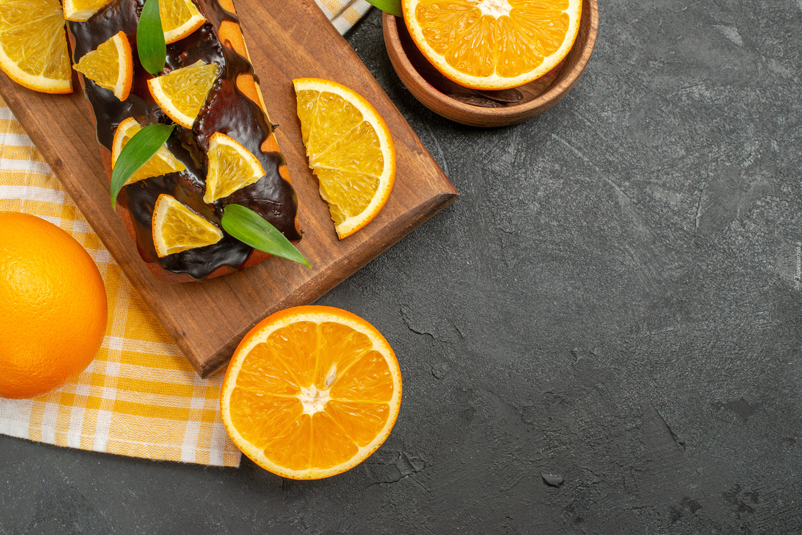 Edytor tapety: Ciasto z polewą i cząstkami pomarańczy na desce