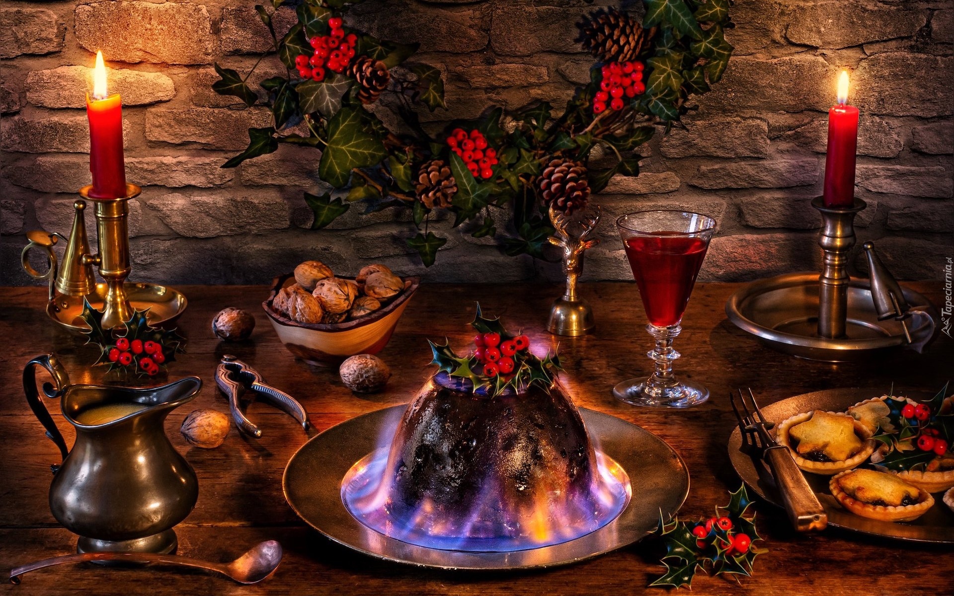 Edytor tapety: Płonący świąteczny pudding przy świecach