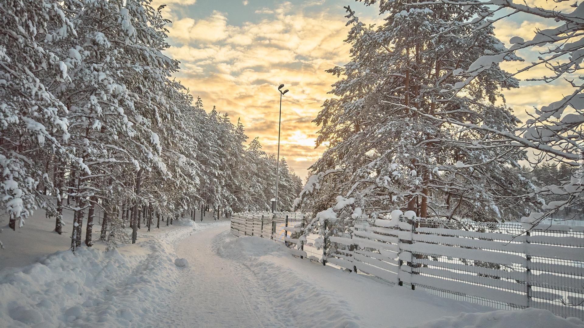 Edytor tapety: Ośnieżone drzewa i ogrodzenie przy drodze w parku