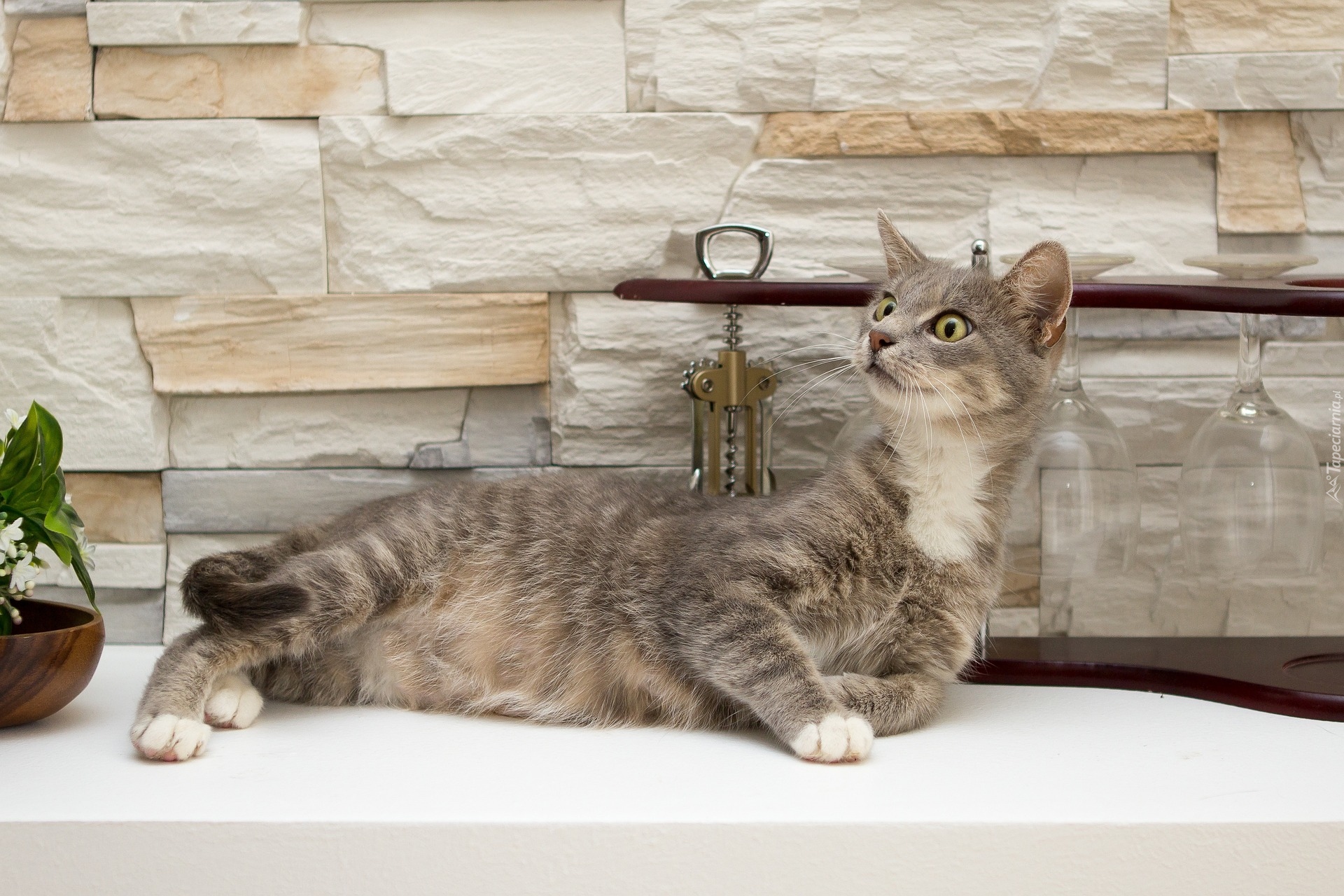 Edytor tapety: Szary kotek na blacie w kuchni