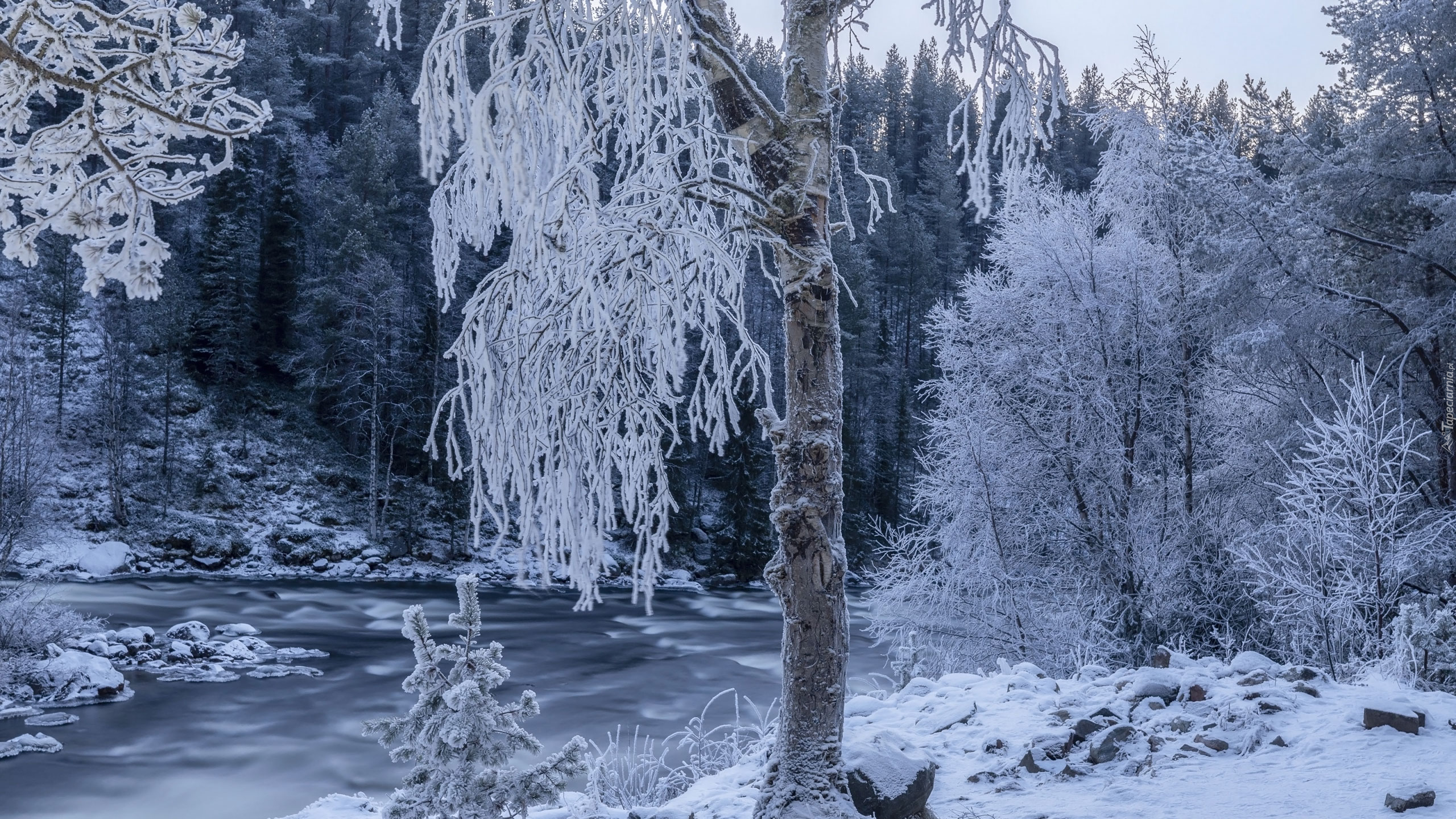 Edytor tapety: Ośnieżone drzewa na skraju rzeki