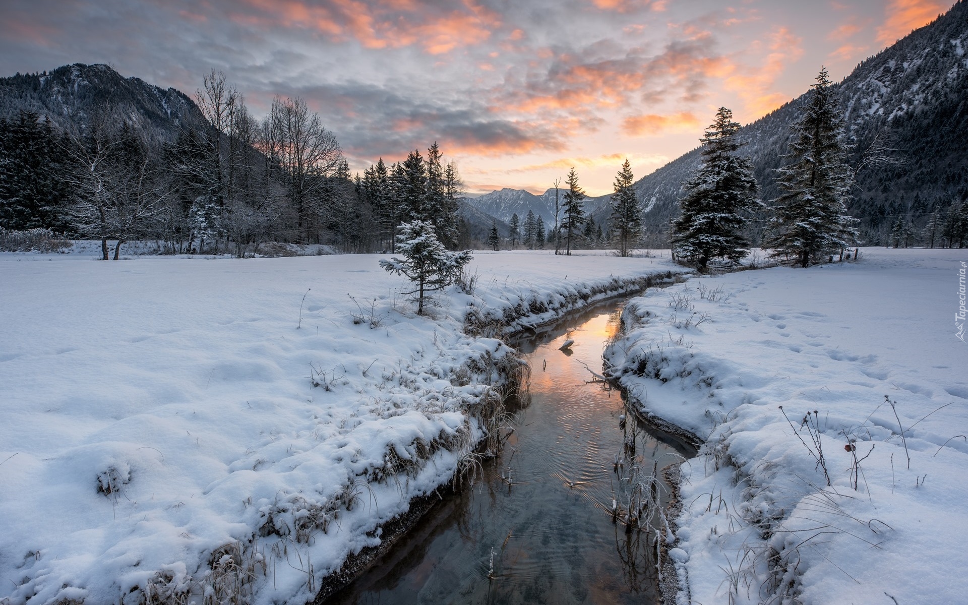 Edytor tapety: Śnieg na brzegach potoku i góry w tle