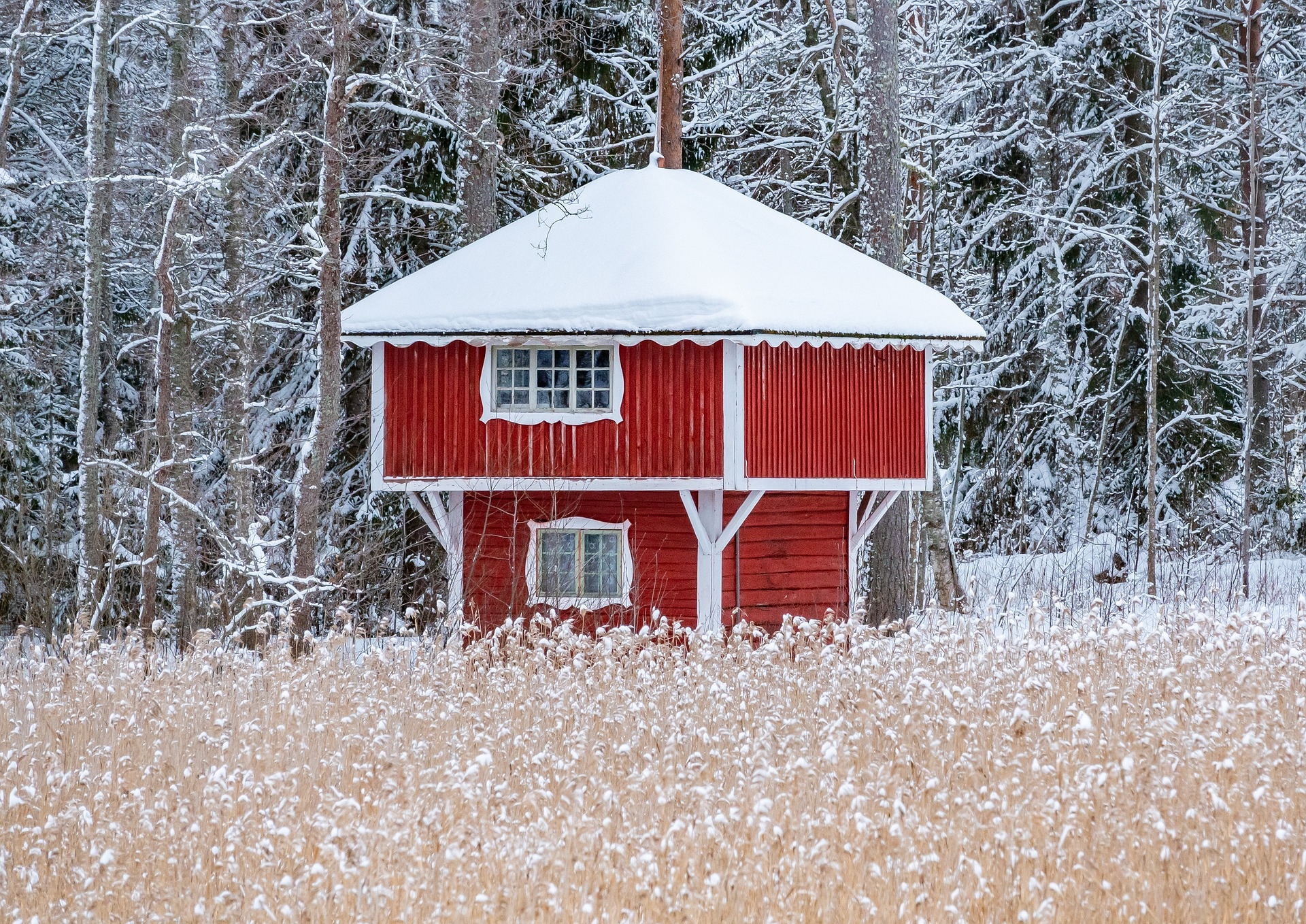 Edytor tapety: Czerwony dom wśród ośnieżonych traw pod lasem