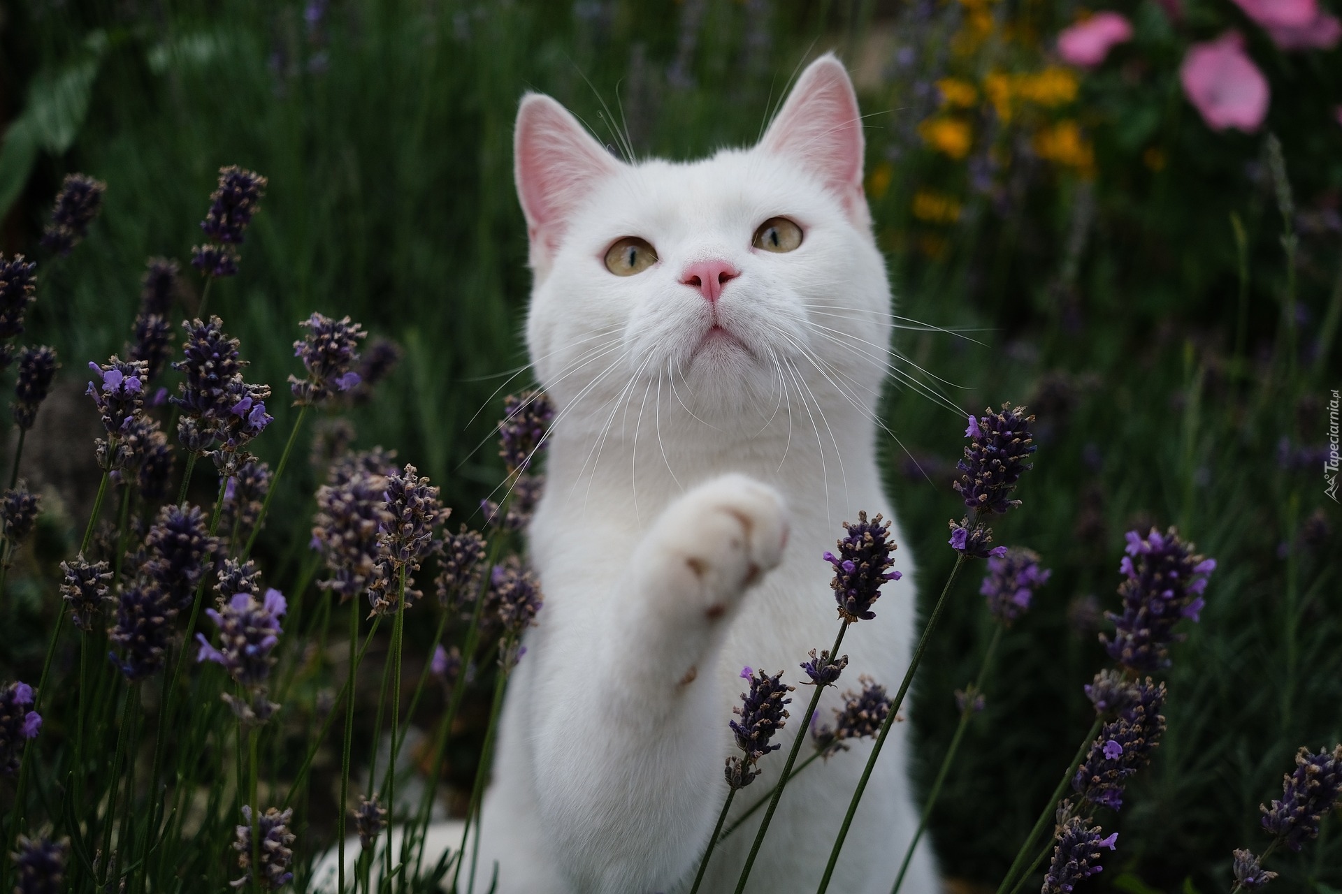 Edytor tapety: Biały kotek pośród kwiatów