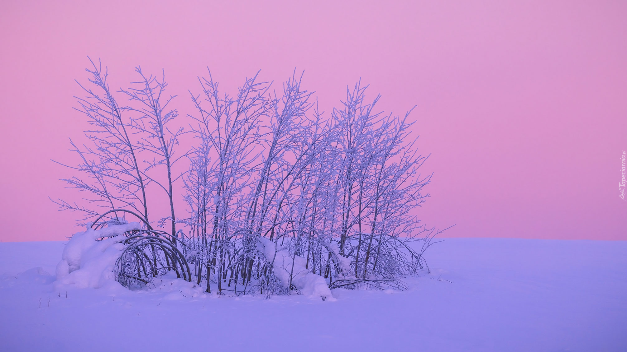 Edytor tapety: Krzew w śniegu na tle różowego nieba
