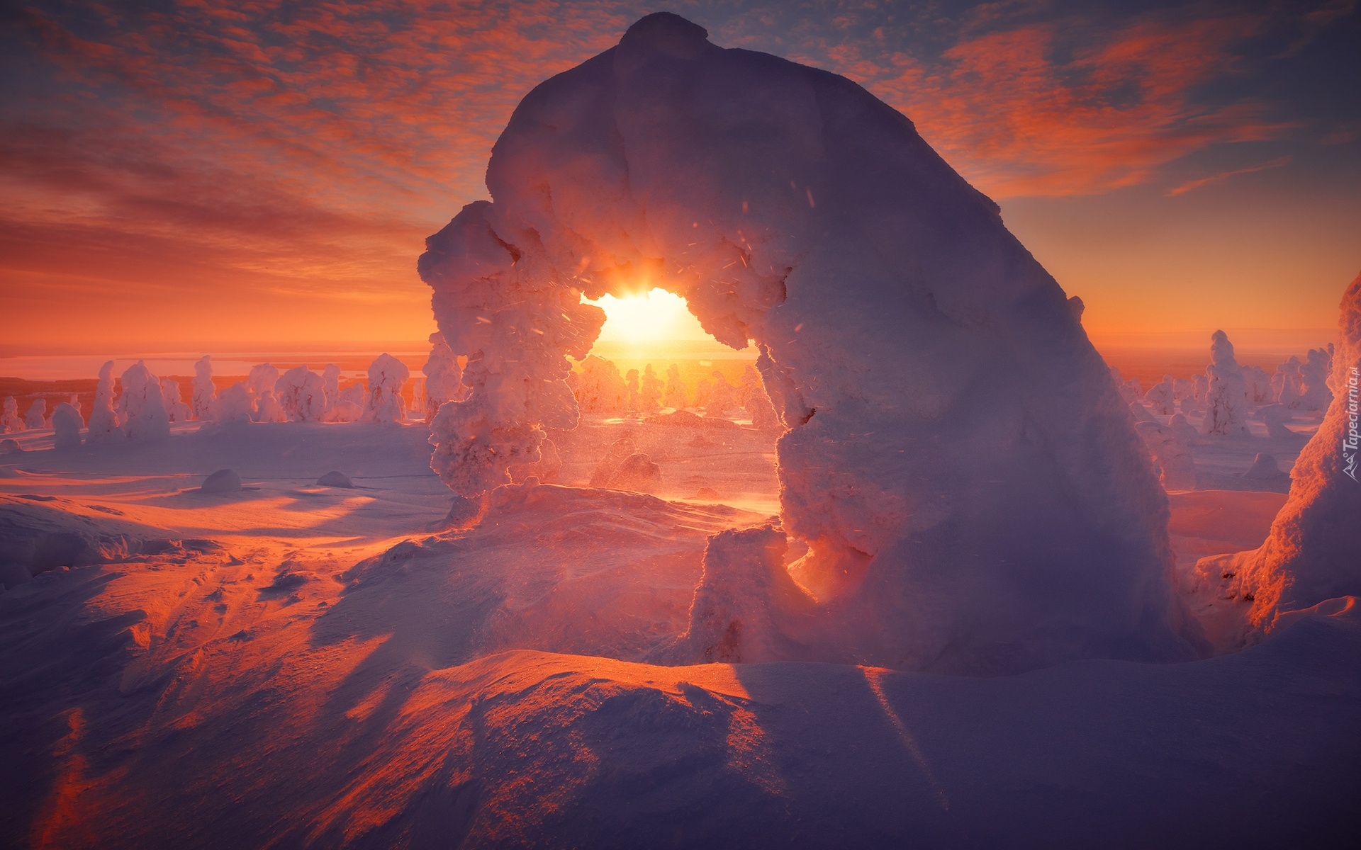 Edytor tapety: Kolorowe niebo zachodzącego słońca nad drzewami w zaspach