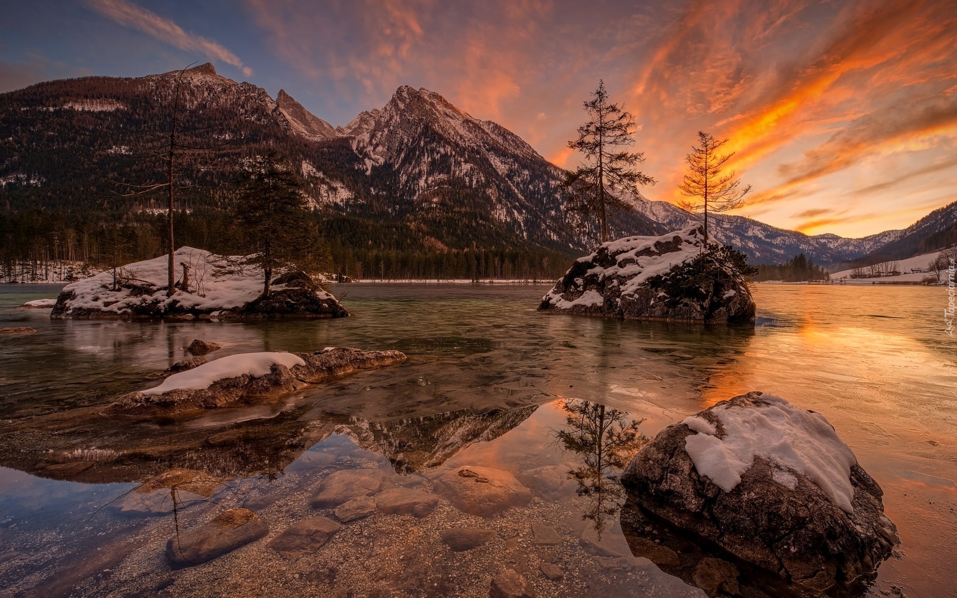 Edytor tapety: Kolorowe niebo nad jeziorem Hintersee w zimowej scenerii