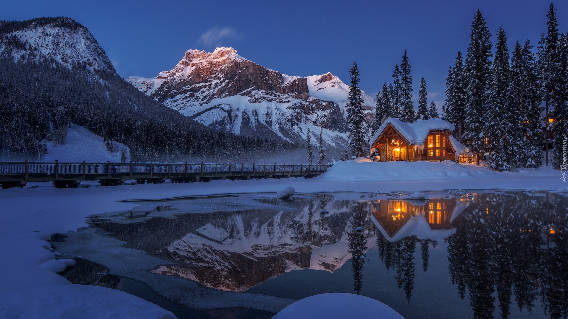 Edytor tapety: Domek nad jeziorem Emerald Lake w zimowej scenerii