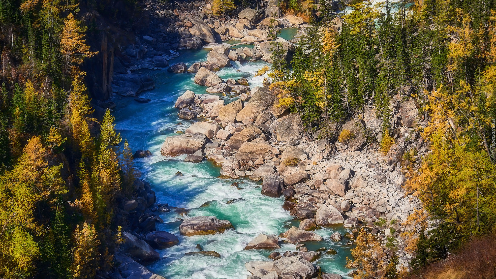Edytor tapety: Kamienie w rzece i drzewa na skałach