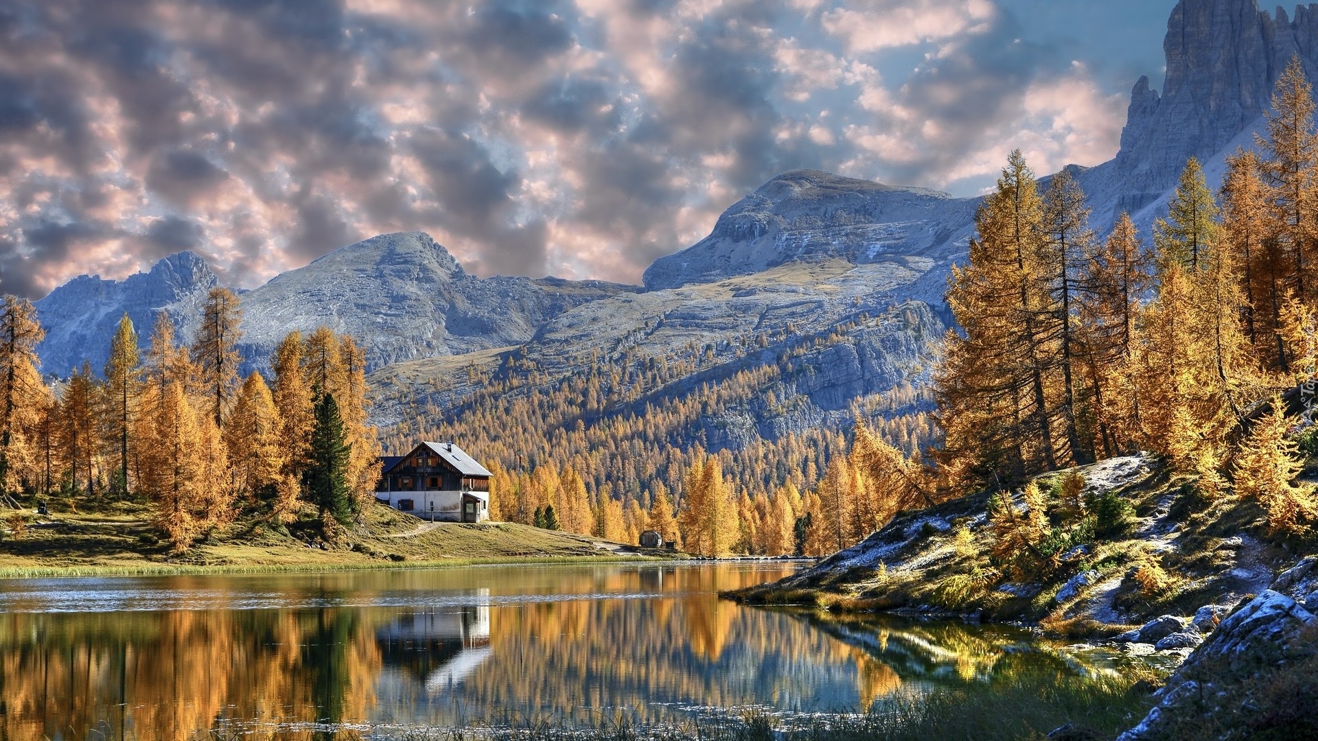 Edytor tapety: Pożółkłe modrzewie i dom nad jeziorem Federa Lake