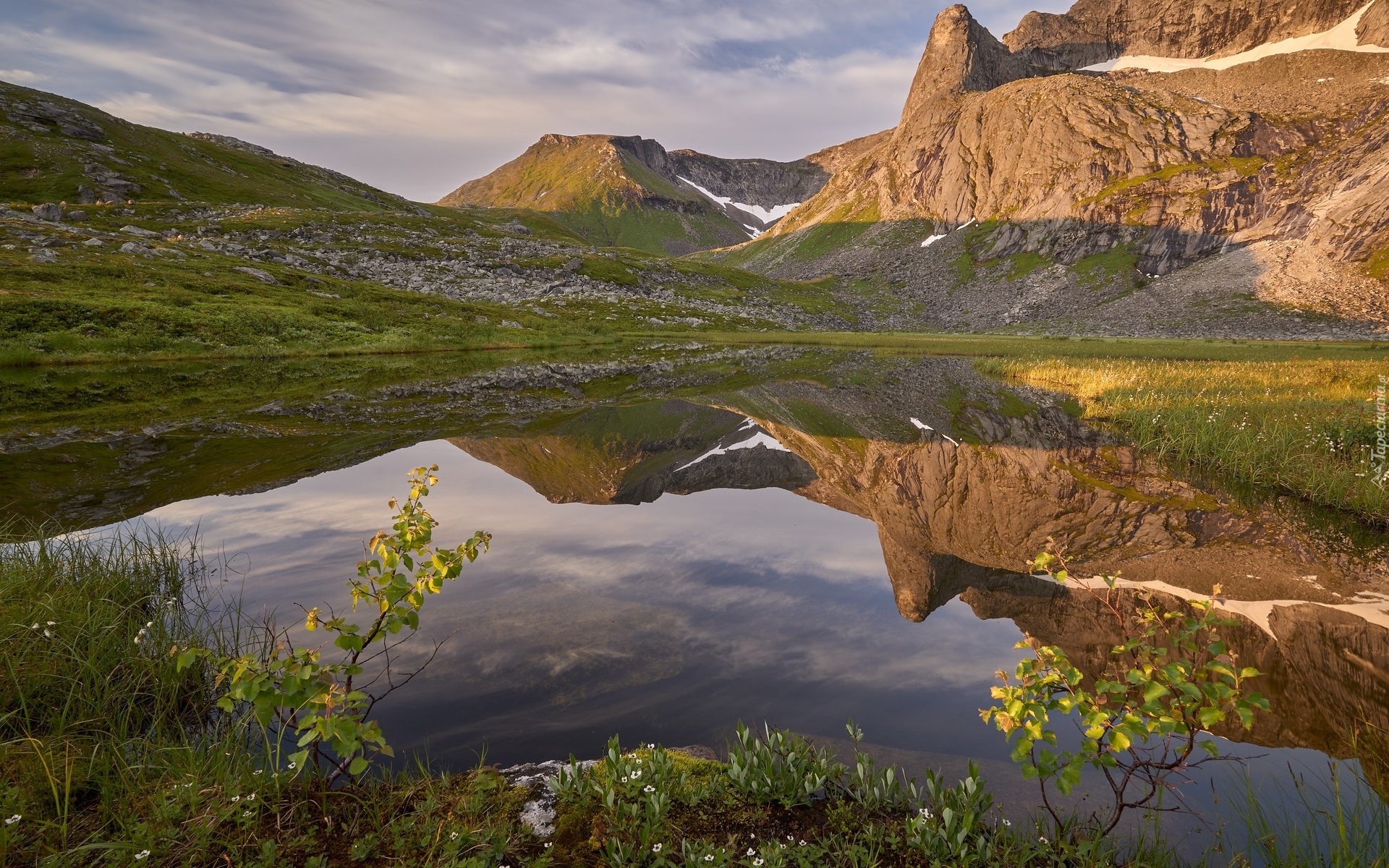 Edytor tapety: Odbicie rozświetlonych skalistych gór w jeziorze