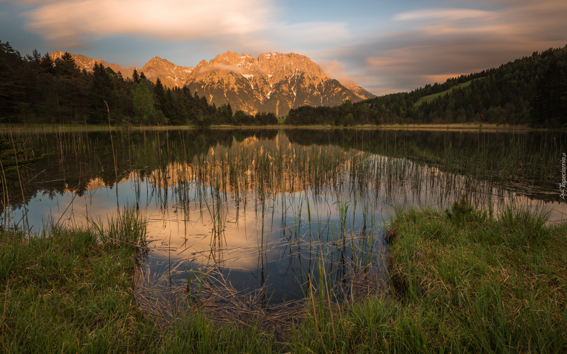 Edytor tapety: Odbicie rozświetlonych gór i traw w jeziorze