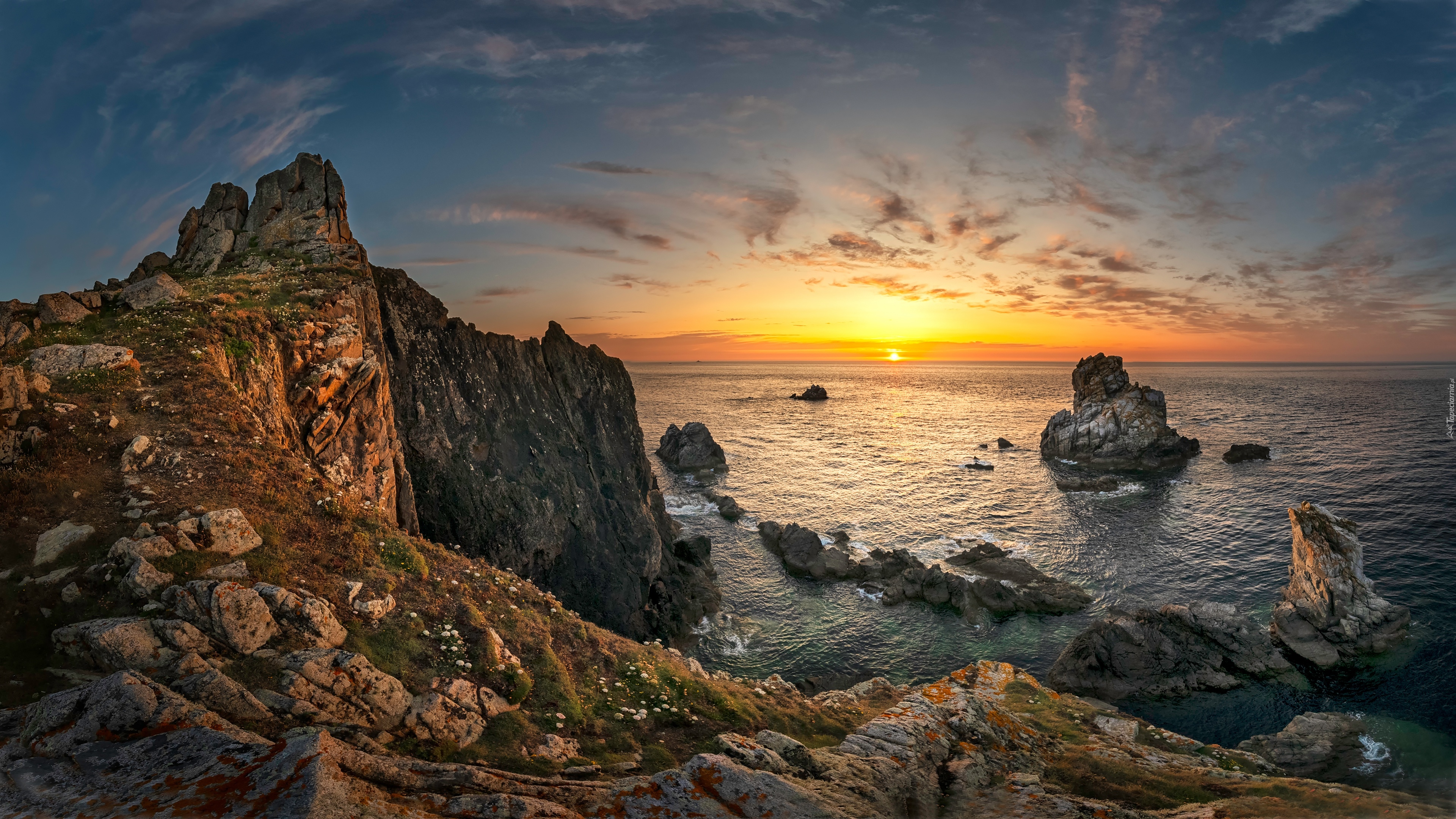 Edytor tapety: Skały na kamienistym brzegu morza o zachodzie słońca