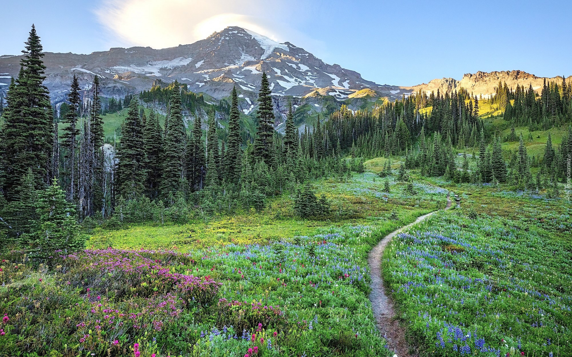 Edytor tapety: Ścieżka przez ukwieconą łąkę w górach