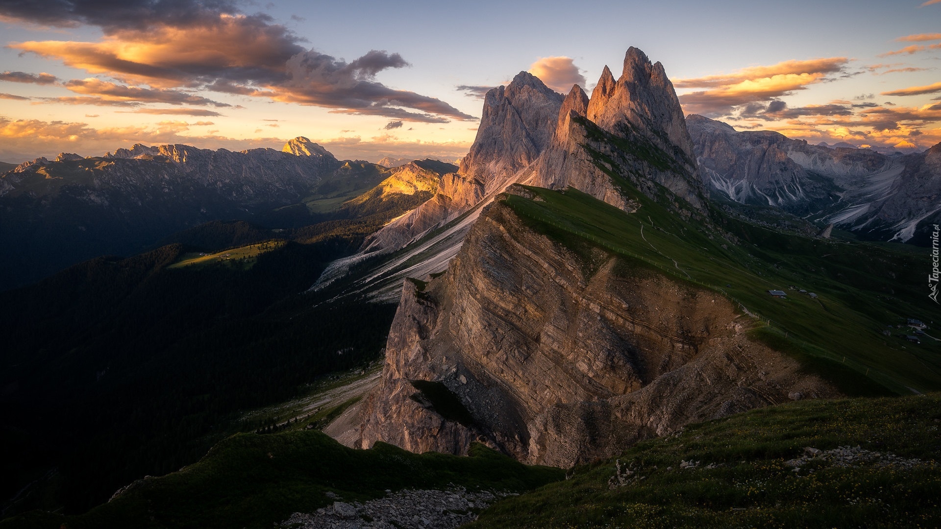 Edytor tapety: Rozświetlony szczyt Seceda w Dolomitach