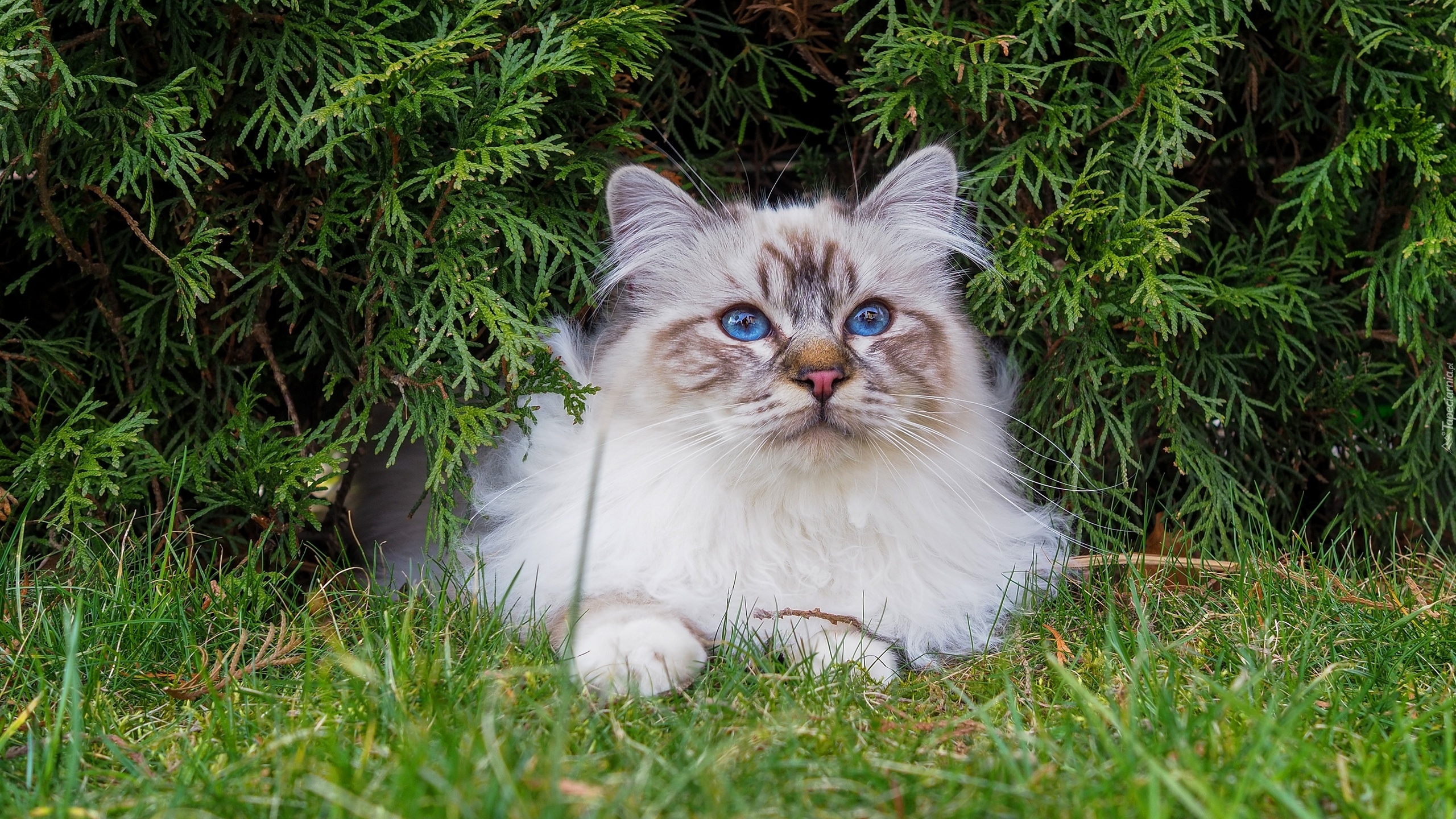 Edytor tapety: Ragdoll niebieskooki pod krzewem