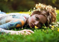 Edytor tapety: Kobieta z tatuażem i wiankiem leżąca na trawie