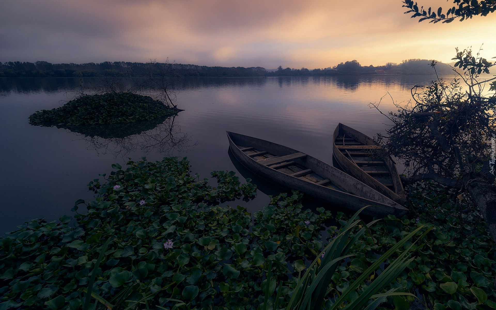 Edytor tapety: Łódki na brzegu rzeki o poranku