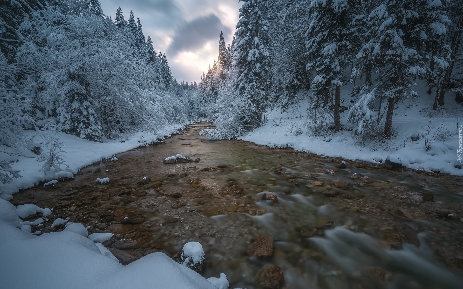Edytor tapety: Ośnieżone drzewa na brzegach kamienistej rzeki