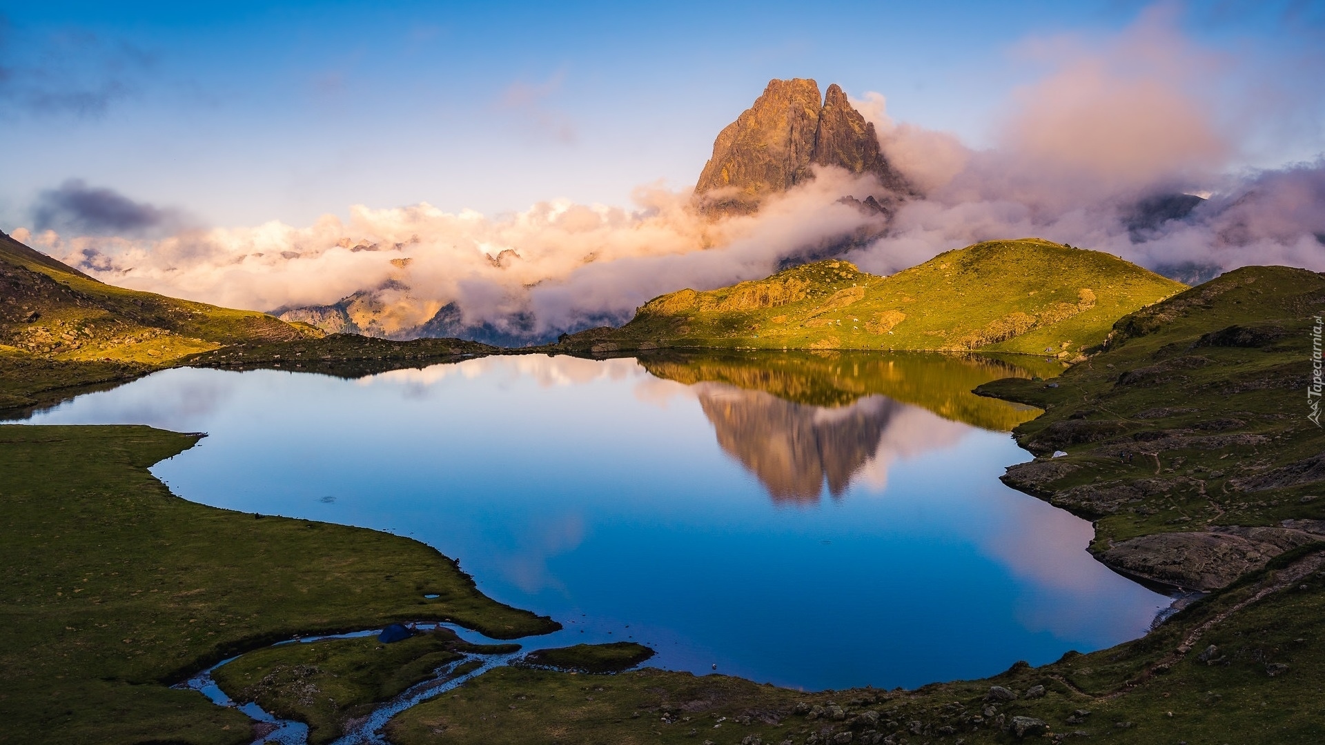 Edytor tapety: Jezioro Gentau i szczyt Midi dOssau we Francji