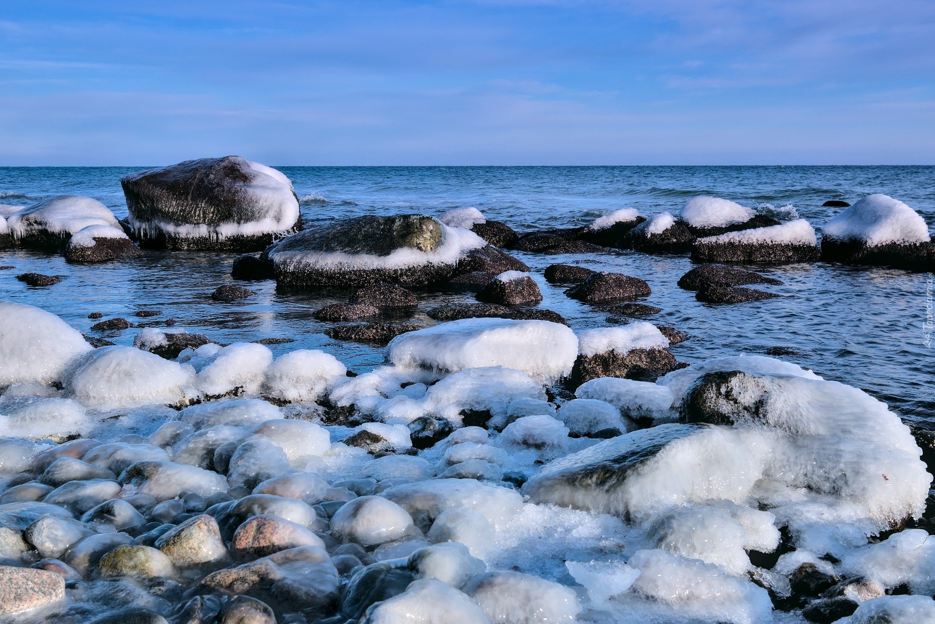 Edytor tapety: Ośnieżone kamienie i głazy na brzegu morza