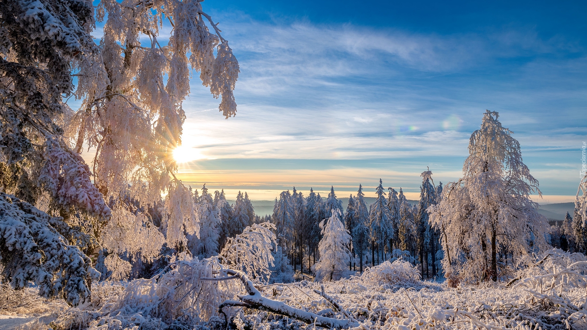 Edytor tapety: Rozświetlone słońcem ośnieżone drzewa na polanie