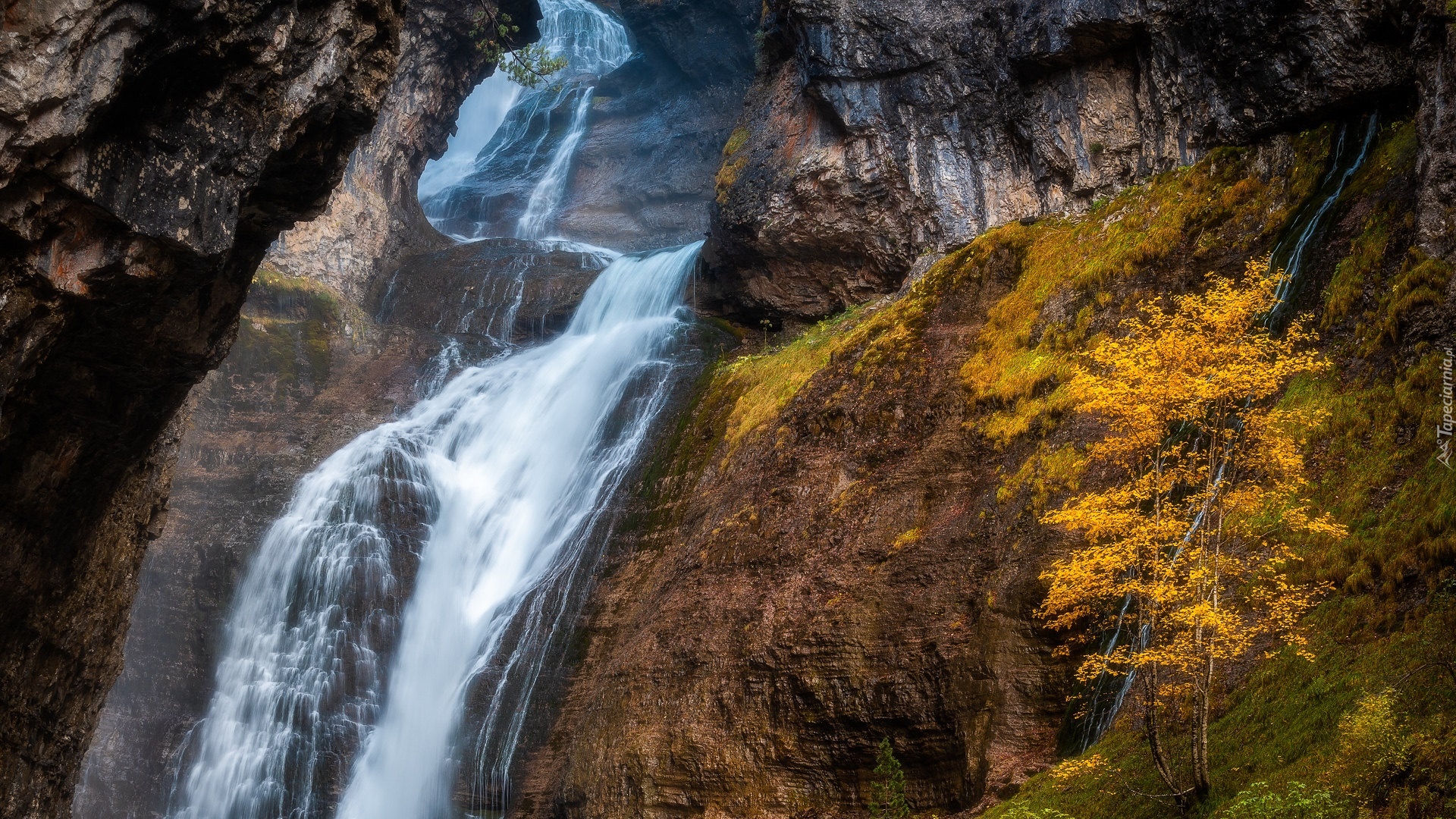 Edytor tapety: Pożółkłe drzewa przy skalnym wodospadzie