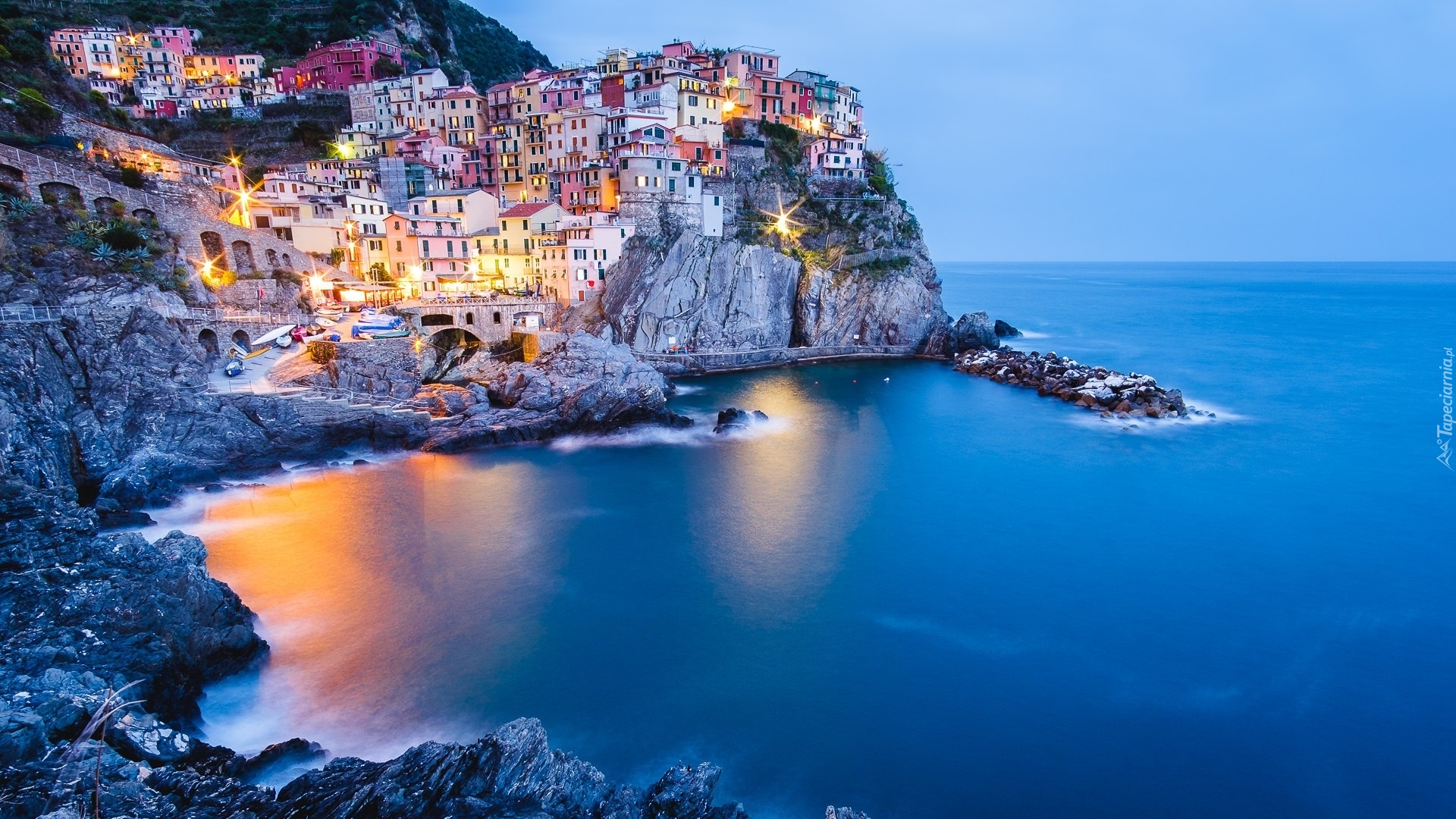 Edytor tapety: Rozświetlone domy w Manaroli nad Morzem Liguryjskim
