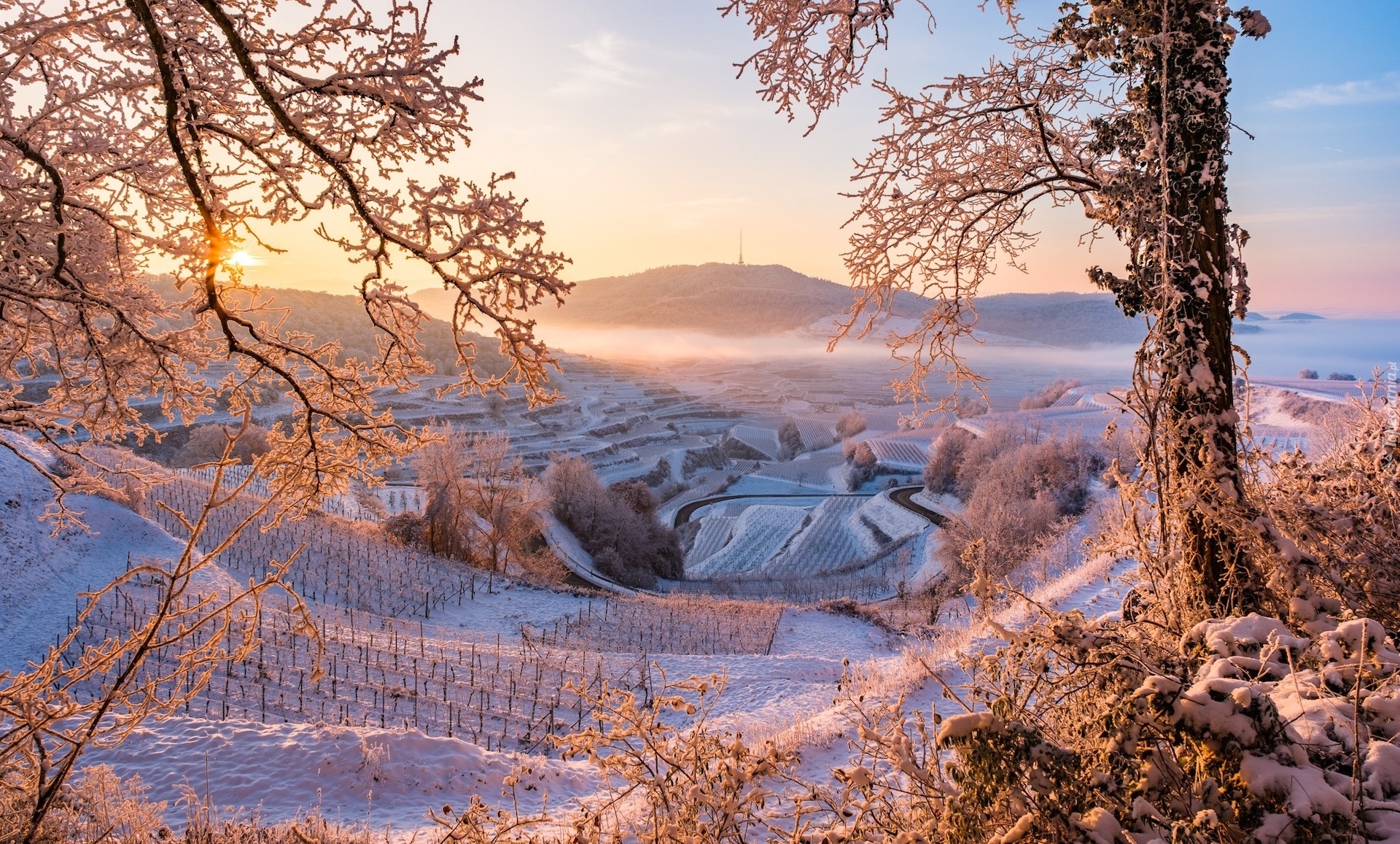 Edytor tapety: Rozświetlone winnice na wzgórzach w Kaiserstuhl zimową porą