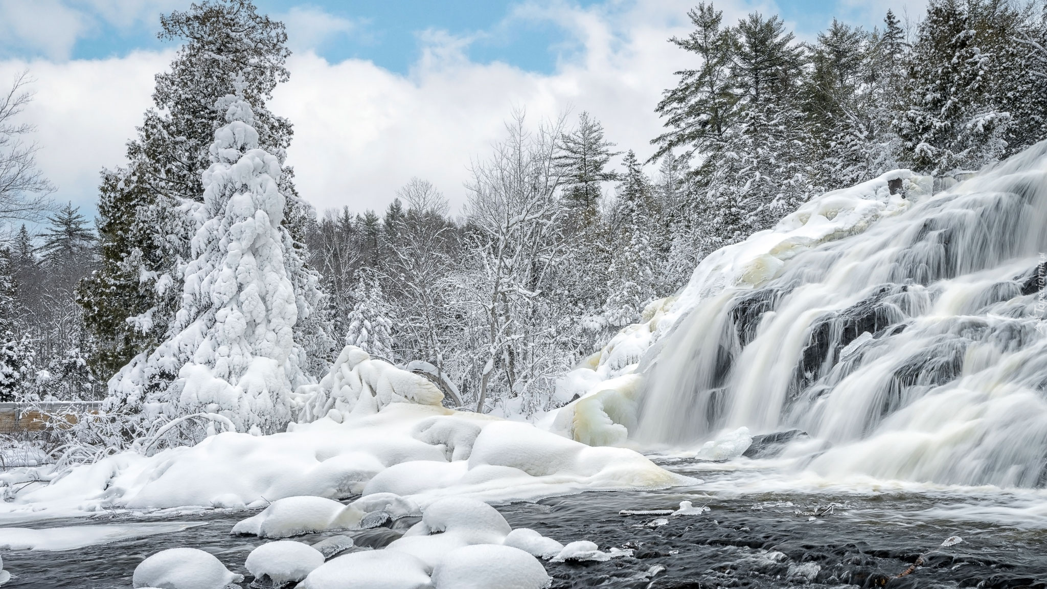 Edytor tapety: Drzewa nad wodospadem Bond Falls zimową porą