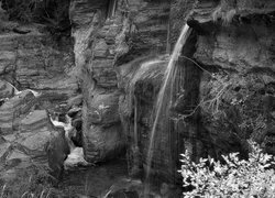 Edytor tapety: Wodospad i krzewy na skałach