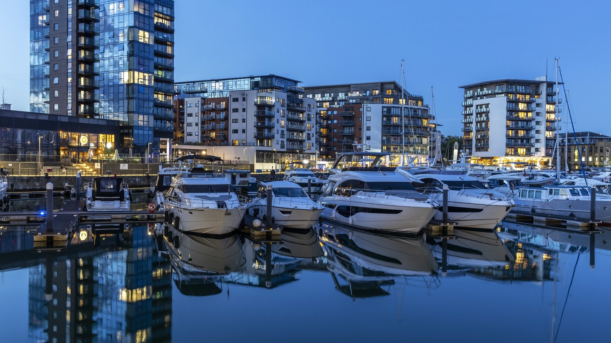 Edytor tapety: Przystań motorówek i wieżowce w tle